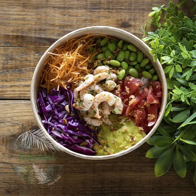 Riz vinaigré, crevettes marinées, grenade, edamame, guacamole, gingembre, chou rouge, oignons frits, sauce spicy mayo maison.